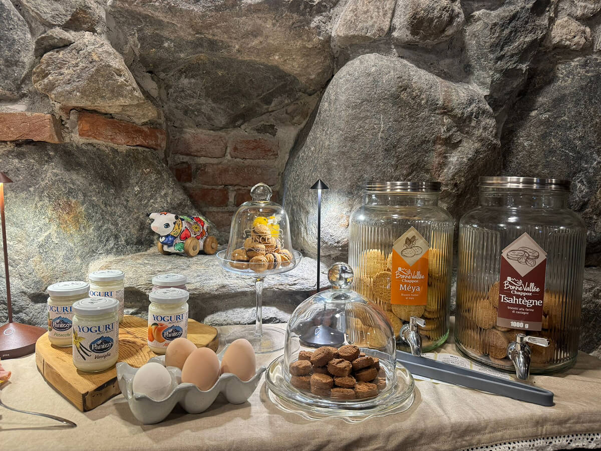 La sala colazioni è intima ed elegante, con arredi raffinati che fondono legno e dettagli alpini. L’atmosfera è calda e accogliente, creando uno spazio ideale per un risveglio tranquillo. Il servizio è attento e discreto, e la qualità delle proposte culinarie riflette una selezione accurata di ingredienti freschi e locali, per offrire agli ospiti un’esperienza di gusto autentica e ricercata.