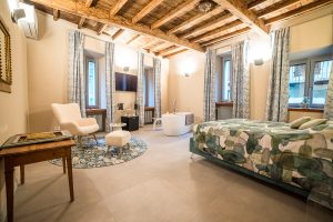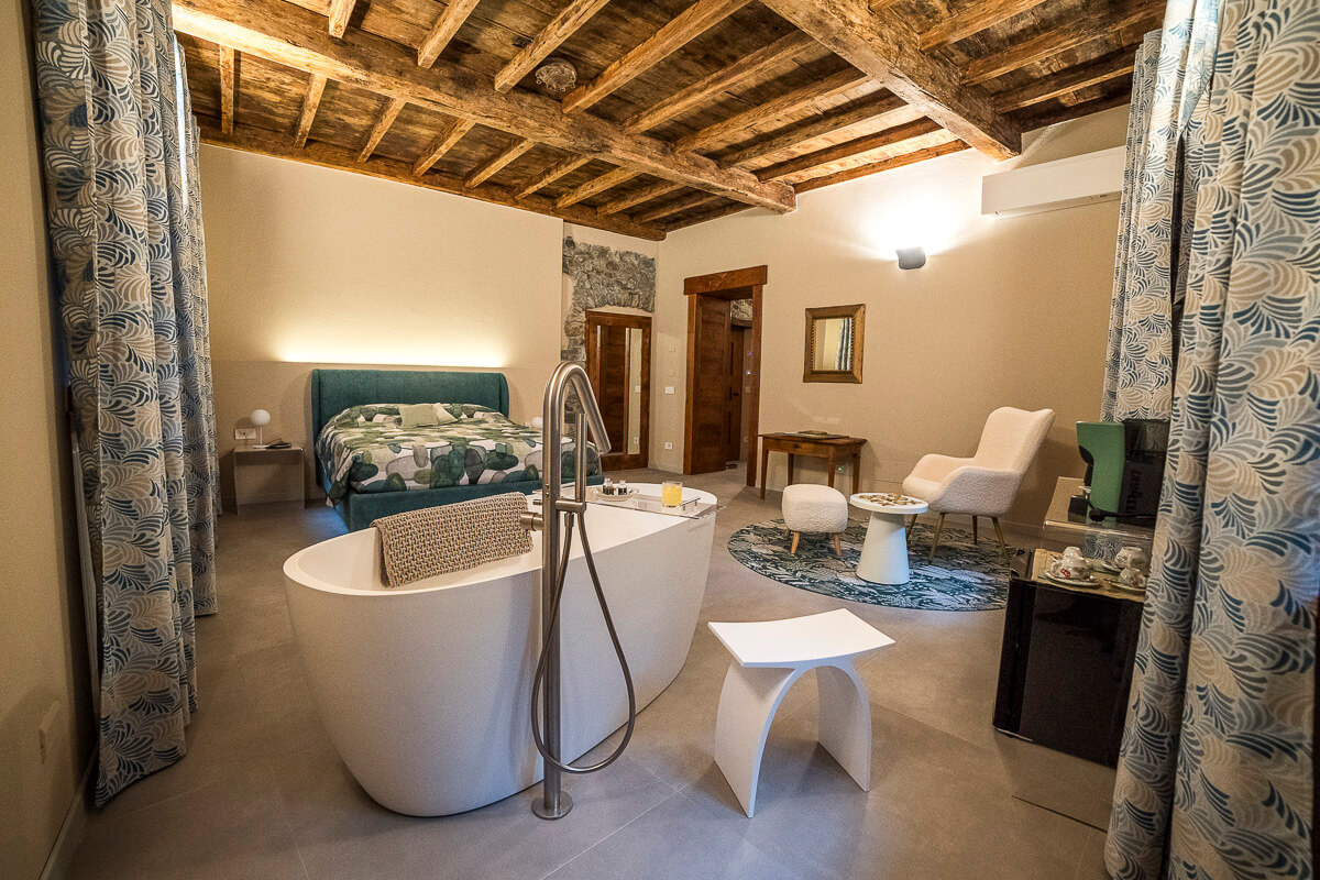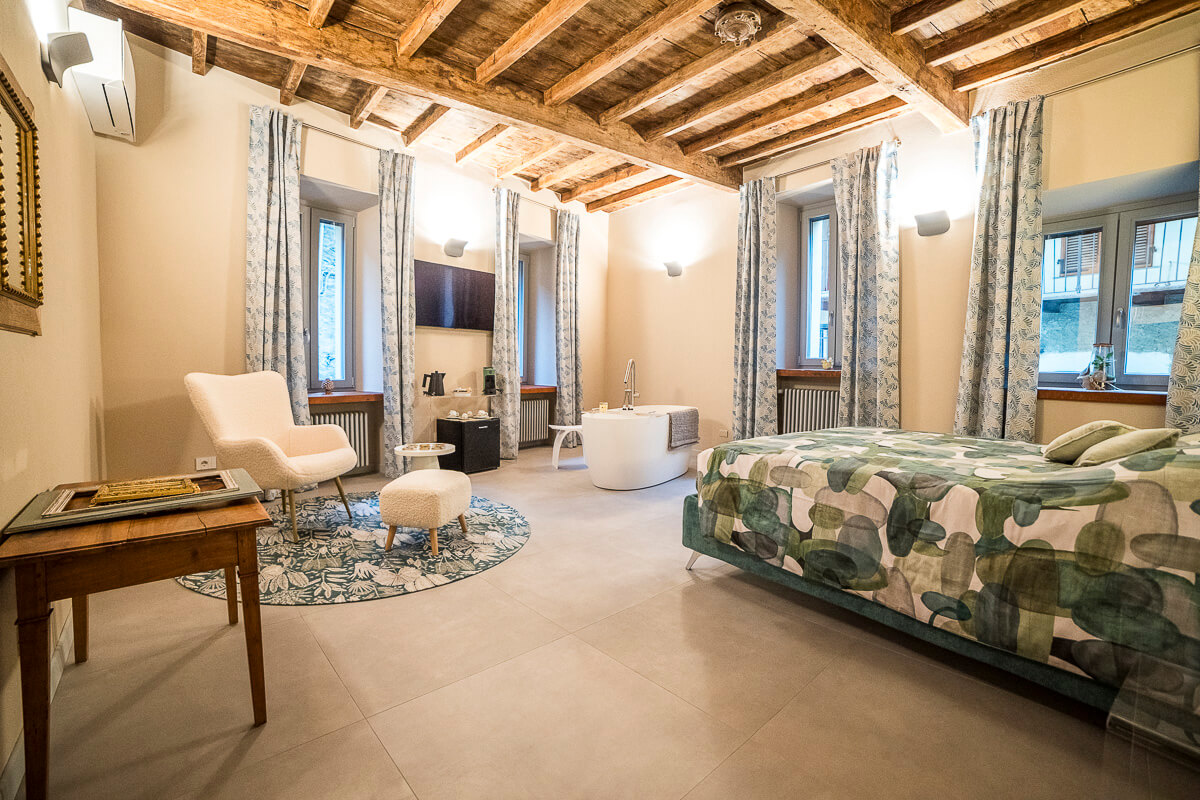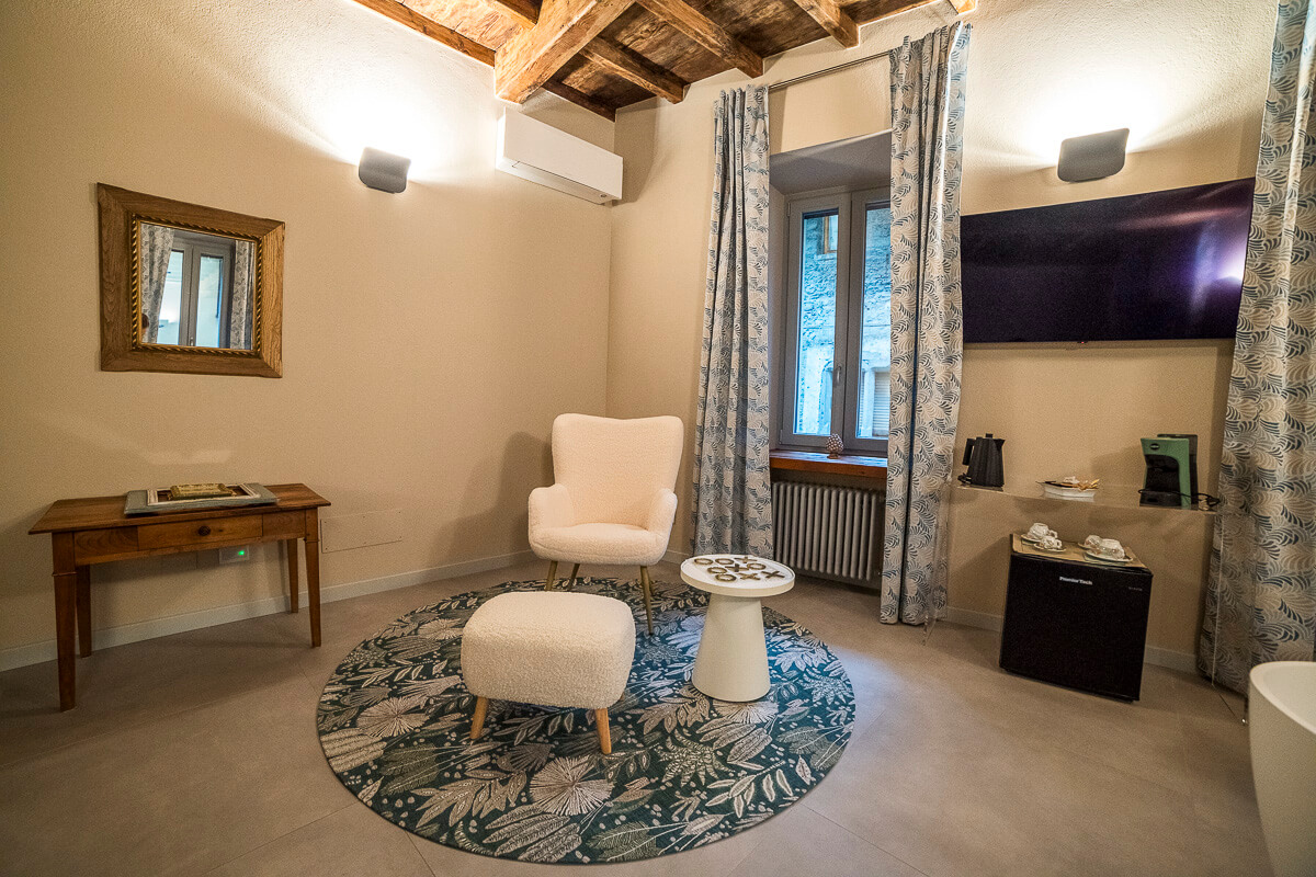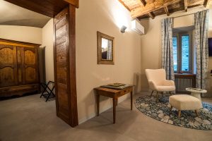 La suite Charmante è un’elegante oasi di comfort e stile, progettata per offrire un soggiorno raffinato e rilassante. La stanza è arredata con eleganza e dispone di un’ampia vasca da bagno, perfetta per momenti di puro relax. Inoltre, è arricchita da un raffinato salottino, ideale per godersi attimi di comfort e tranquillità in un ambiente ricercato. Ideale per chi desidera una fuga romantica, la suite Charmante garantisce un’esperienza di soggiorno intima e indimenticabile, curata in ogni dettaglio. Le suite Petite e Charmante sono collegate, per offrirvi il piacere di spazi comunicanti e sempre a portata di mano.